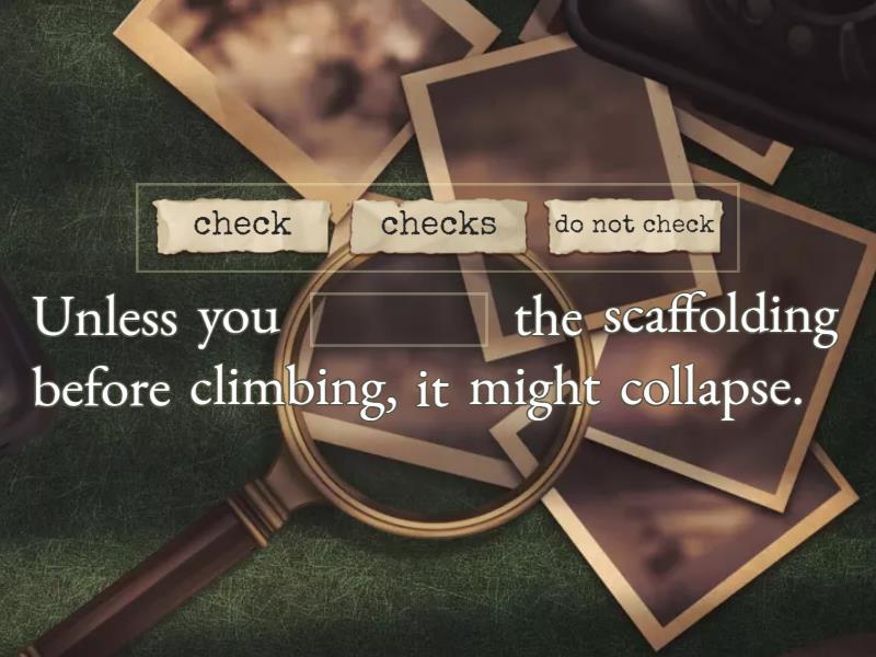Unless you ____ the scaffolding before climbing, it might collapse. If the weather ____ too windy, working on the roof can become dangerous. You won’t be allowed to climb the tower unless you ____ received proper training. Unless there ____ proper ventilation, toxic gases can accumulate in the septic tank. ____ you ____ the tank without a gas detector, you ____ suffocation. The worker must not enter the confined space ____ another person ____ outside. Unless you ____ the oxygen level first, it cannot be safe to go inside. You can't operate this machine unless you ____ a license. ____ you don’t secure the ladder properly, it ____ slip while you’re climbing.