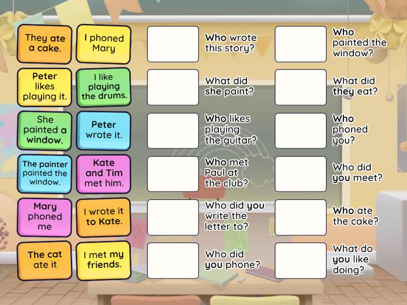 I phoned Mary - Who did you phone?, Mary phoned me - Who phoned you?, Peter wrote it. - Who wrote this story?, I wrote it to Kate. - Who did you write the letter to?, She painted a window. - What did she paint?, The painter painted the window. - Who painted the window?, I like playing the drums. - What do you like doing?, Peter likes playing it. - Who likes playing the guitar?, The cat ate it - Who ate the cake?, They ate a cake. - What did they eat?, I met my friends. - Who did you meet?, Kate and Tim met him. - Who met Paul at the club?,