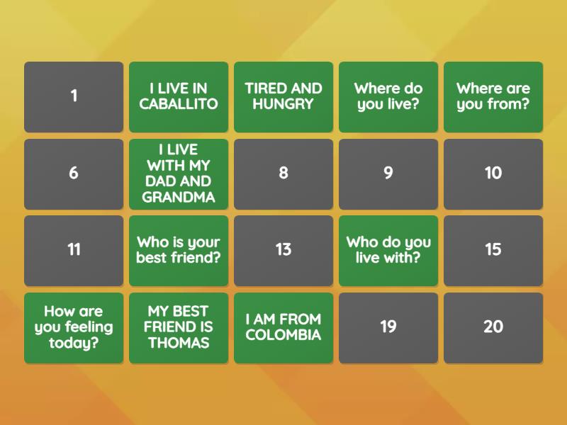Where are you from? - I AM FROM COLOMBIA, Where do you live? - I LIVE IN CABALLITO, Who is your best friend? - MY BEST FRIEND IS THOMAS, How are you feeling today? - TIRED AND HUNGRY, Who do you live with? - I LIVE WITH MY DAD AND GRANDMA, How old are you? - I AM 10 YEARS OLD, What’s the weather like? - IT IS COLD AND SUNNY, What is there in your school bag today? - THERE ARE TWO FOLDERS AND A PENCIL CASE, What are you wearing? - I AM WEARING BLUE JEANS, A RED T-SHIRT AND A JACKET, What are your classmates doing? - THEY ARE TALKING,
