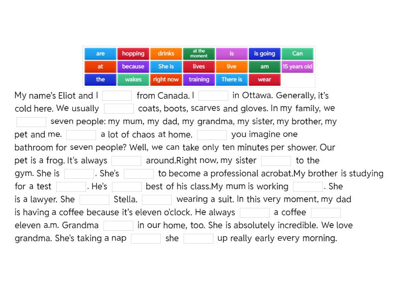 My name's Eliot and I ____ from Canada. I ____ in Ottawa. Generally, it's cold here. We usually ____ coats, boots, scarves and gloves. In my family, we ____ seven people: my mum, my dad, my grandma, my sister, my brother, my pet and me. ____ a lot of chaos at home. ____ you imagine one bathroom for seven people? Well, we can take only ten minutes per shower. Our pet is a frog. It's always ____ around.Right now, my sister ____ to the gym. She is ____. She's ____ to become a professional acrobat.My brother is studying for a test ____. He's ____ best of his class.My mum is working ____. She is a lawyer. She ____ Stella. ____ wearing a suit. In this very moment, my dad is having a coffee because it's eleven o'clock. He always ____ a coffee ____ eleven a.m. Grandma ____ in our home, too. She is absolutely incredible. We love grandma. She's taking a nap ____ she ____ up really early every morning.