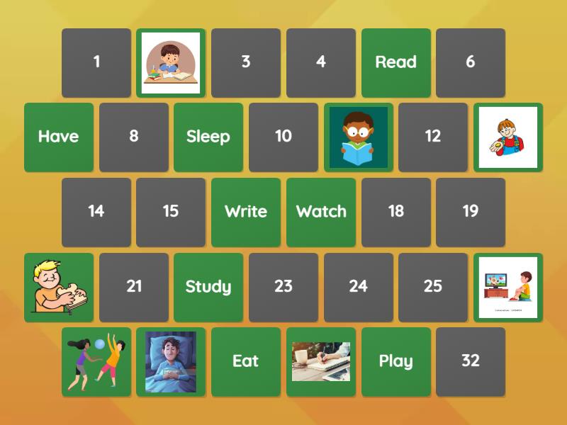 Play, Eat, Study, Write, Read , Sleep, Have, Watch, Jump, Swim, Cook, Run, Paint, Drink, Dance, listen,