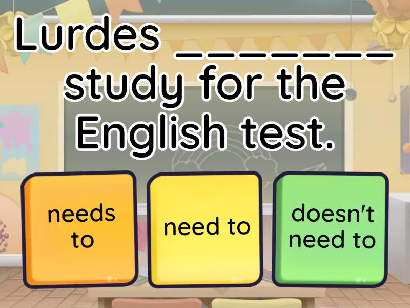 1) Lurdes _______ study for the English test. a) needs to b) need to c) doesn't need to 2) I can't play Roblox with you. I _______ go to bed. a) needs to b) need to c) don't need to 3) My mom _______ go to the supermarket. She needs sugar. a) don't need to b) needs to c) need to 4) They _______ do the washing up. Everything is dirty a) needs to b) don't need to c) need to 5) Teresa can't see well, so she _______ wear glasses a) needs to b) need to c) doesn't need to 6) My friend isn't good at Maths, so he _______ study harder for the test. a) need to b) needs to c) don't need to 7) My grandparents _______ go to the cinema because they have a big screen at home. a) need to b) don't need to c) doesn't need to 8) You _______ buy the jacket because it's very cold a) don't need to b) needs to c) doesn't need to d) need to 9) You _______ go to the school. It's Sunday. a) don't need to b) needs to c) doesn't need to d) need to