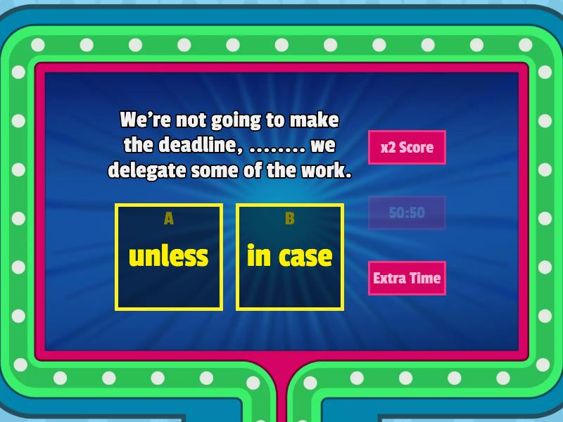 1) We're not going to make the deadline, ........ we delegate some of the work. a) unless b) in case 2) .......if I get a raise, I'm still going to leave. a) even if b) unless 3) We need to make a back up copy.....we lose the original version a) unless b) in case 4) ......... a cancellation, we can reschedule for the following week. a) in case of b) in case 5) ....... I forget, please send me a reminder a) even if b) in case 6) Don't send it, ......I tell you to. a) unless b) if