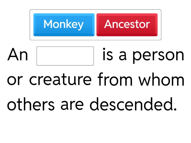 An ____ is a person or creature from whom others are descended. ____ is the process by which organisms change over time. An ____ helps organisms survive better in their environment. 4. A ____ is a physical or behavioral characteristic passed down. All humans share an ____ with other species. A ____ is a sudden change in a gene. ____ selection favors individuals best adapted to their environment. A ____ is a preserved trace of an ancient organism. A ____ is a group of organisms that can reproduce. A ____ is a misunderstanding or incorrect belief. ____ leads to the disappearance of a species. ____ is the material that carries genetic information. ____ shows how species diverge like branches from a tree. A ____ is an animal with a backbone. A ____ is one stage in the history of a species or family.