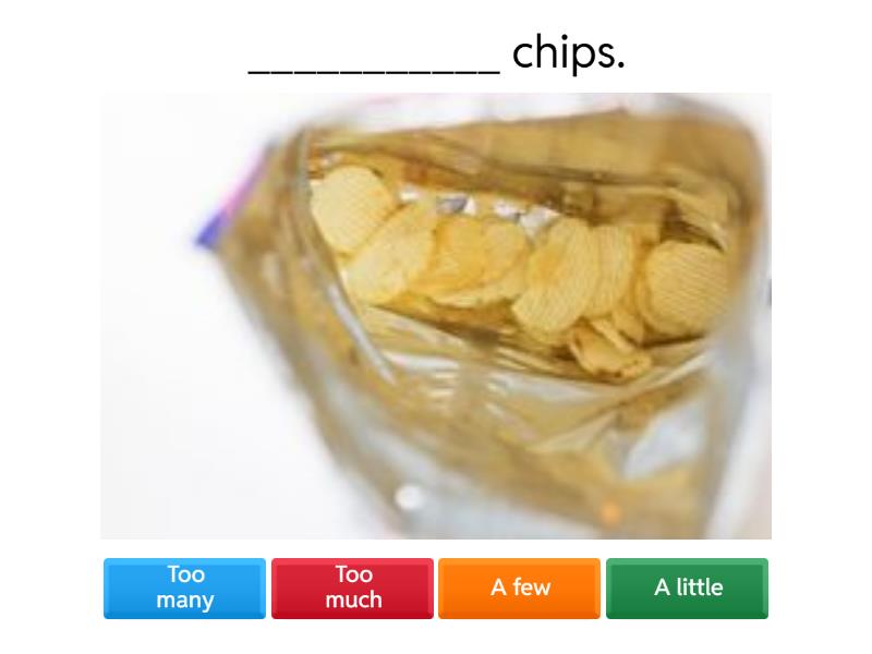 1) ___________ chips. a) Too many b) Too much c) A few d) A little 2) __________ boxes of cookies. a) Too many b) Too much c) A few d) A little 3) __________ water. a) Too many b) Too much c) A few d) A little 4) __________ junk food. a) Too many b) Too much c) A few d) A little 5) __________ salad. a) Too many b) Too much c) A few d) A little 6) __________ fruits. a) Too many b) Too much c) A few d) A little 7) __________ mayonnaise. a) Too many b) Too much c) A few d) A little 8) __________ bottles of water. a) Too many b) Too much c) A few d) A little 9) __________ chocolate. a) Too many b) Too much c) A few d) A little 10) __________ soda. a) Too many b) Too much c) A few d) A little 11) __________ jars of nutella. a) Too many b) Too much c) A few d) A little 12) This person probably does ______ eat _______ vegetables. a) enough b) not ... enough c) more d) less e) fewer 13) This woman eats ______ fruits and vegetables now than before. a) enough b) not ... enough c) more d) less e) fewer 14) I always try to drink ______ water. At least 2 liters a day. a) enough b) not ... enough c) more d) less e) fewer 15) Since I decided to eat _______ cookies, I've lost weight! a) enough b) not ... enough c) more d) less e) fewer 16) Buying _______ healthy food and more junk food will not do you good. a) enough b) not ... enough c) more d) less e) fewer 17) - How's your diet going? - Very well! I eat _______ protein and drink ______ water every day and I feel great. a) enough b) not ... enough c) more d) less e) fewer 18) I usually eat healthy and all kinds of food. Except for vegetables. I think I need to eat _____ of them. a) enough b) not ... enough c) more d) less e) fewer 19) It's probably a good decision to eat _____ salt in my daily life. a) enough b) not ... enough c) more d) less e) fewer 20) My diet does ______ have _____ nutrients. I need to stop going to the Papa Johns. a) enough b) not ... enough c) more d) less e) fewer