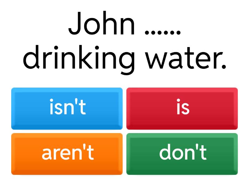 1) John ...... drinking water. a) isn't b) is c) aren't d) don't 2) Mary ...... running a marathon. a) isn't b) aren't c) is d) don't 3) The kids ..... playing with their toys. a) isn't b) aren't c) not d) is 4) The teachers ..... watching the kids. a) is b) do c) aren't d) isn't 5) Sophie ..... drawing a butterfly. a) don't b) doesn't c) aren't d) isn't 6) ...... Tony talking on the phone?  a) Is b) Do c) Does d) Are 7) ....... John and Mary looking at the sky? a) Is b) Does c) Are d) Do 8) ....... the teachers wearing jackets? a) are b) Do c) Does d) Are 9) ........ Sophie eating a sandwich? a) Does b) Do c) Is d) Are 10) ........ the parents sitting down? a) Is b) Are c) Do d) Does