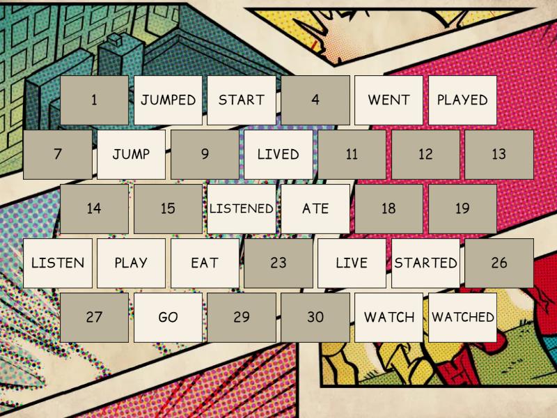 LIVE - LIVED, START - STARTED, LISTEN - LISTENED, PLAY - PLAYED, JUMP - JUMPED, WATCH - WATCHED, GO - WENT, EAT - ATE, DRINK - DRANK, SEE - SAW, CAN - COULD, GET UP - GOT UP, DANCE - DANCED, DO - DID, WRITE - WROTE, STUDY - STUDIED,