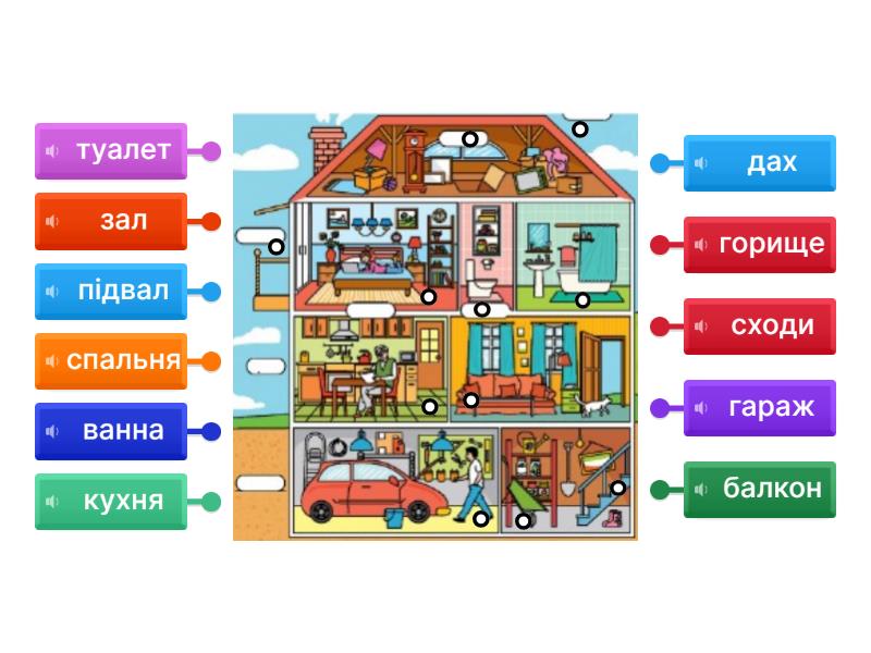 дах, горище, спальня, балкон, туалет, ванна, кухня, зал, гараж, підвал, сходи.