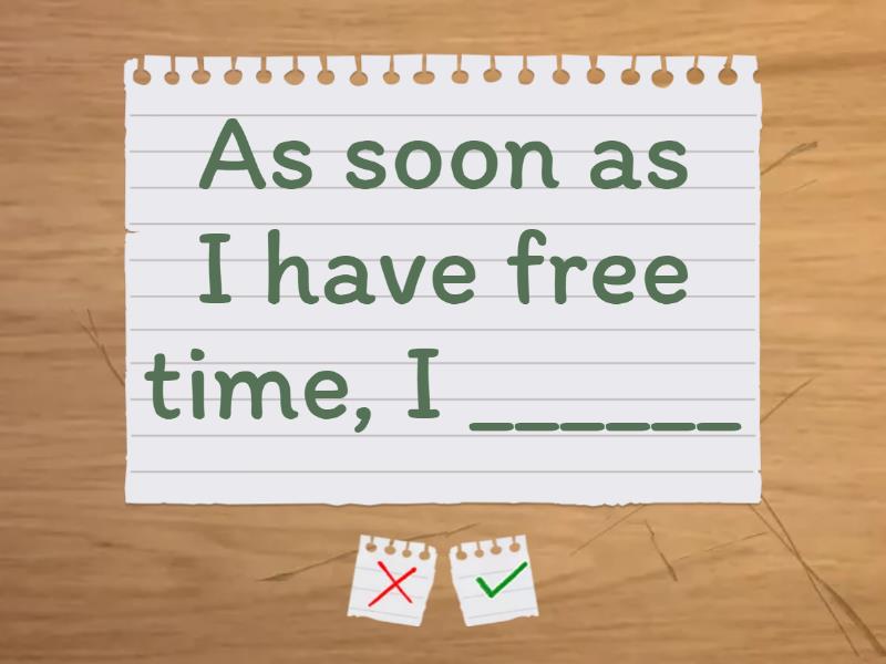 I'll go to bed early today unless______ , When I see my friends I ________ , Unless it rains tomorrow, I _______ , As soon as I finish school, I _______, I'll read Rebecca before I ________ , As soon as I have free time, I ______ , Until I'm 18 years old________________ , By the time I'm 40, I ________________, As soon as I get money, _________________,
