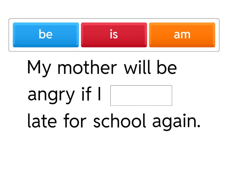 My mother will be angry if I ____ late for school again. If she goes to the birthday party on Sunday, she will take a present. ____ I will call the doctor if my stomach still ____ tomorrow. She will do the exercise again if she ____ a lot of mistakes. If they practice a lot, they ____ the game this weekend. I will take my umbrella if it ____ tomorrow. She will marry him if he ____ her. asks If we go out tonight, we ____ the door. I will make a sandwich if I ____ hungry. If you ____ carefully, you'll know what to do. If she goes out tonight, she ____ it tomorrow morning. I will send you a postcard if you ____ me your address. My brother will miss his appointment if he ____ late. If he ____ a pizza, he will eat the whole thing. orders They ____ out for dinner if there is no food in the house. If the weather is bad, we ____ the picnic. If I ____ late, my parents will be angry. My coworkers ____ the report today if they finish it. If that painting is still for sale, we ____ it. If their grandmother ____ they will sing a song to her.