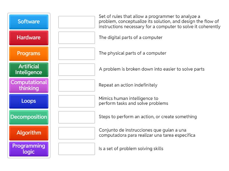 Algorithm - Steps to perform an action, or create something, Decomposition - A problem is broken down into easier to solve parts, Loops - Repeat an action indefinitely, Programs - Conjunto de instrucciones que guían a una computadora para realizar una tarea especifica, Artificial Inteligence - Mimics human intelligence to perform tasks and solve problems, Hardware - The physical parts of a computer, Software - The digital parts of a computer, Computational thinking - Is a set of problem solving skills, Programming logic - Set of rules that allow a programmer to analyze a problem, conceptualize its solution, and design the flow of instructions necessary for a computer to solve it coherently,