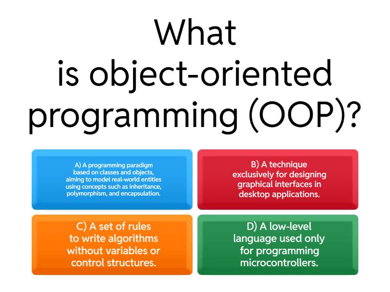 1) What is object-oriented programming (OOP)? a) A) A programming paradigm based on classes and objects, aiming to model real-world entities using concepts such as inheritance, polymorphism, and encapsulation. b) B) A technique exclusively for designing graphical interfaces in desktop applications. c) C) A set of rules to write algorithms without variables or control structures. d) D) A low-level language used only for programming microcontrollers. 2) What is the difference between a compiler and an interpreter? a) A) A compiler translates the whole program into machine code before execution, while an interpreter translates and executes line by line. b) B) A compiler is only used for low-level languages, and an interpreter only for high-level languages. c) C) A compiler turns the program into graphical images, while an interpreter turns it into text. d) D) A compiler runs programs slower than an interpreter because it analyzes all the code multiple times. 3) Which of these data types are reference types? a) A) boolean b) B) integer c) C) String d) D) char 4) How many public classes can a single file have in Java? a) A) Up to two public classes per file. b) B) Only one public class per file. c) C) As many public classes as you want, no limit. d) D) None, public classes cannot be in files. 5) Which keyword is used to create a new instance of a class in Java? a) A) create b) B) instance c) C) object d) D) new
