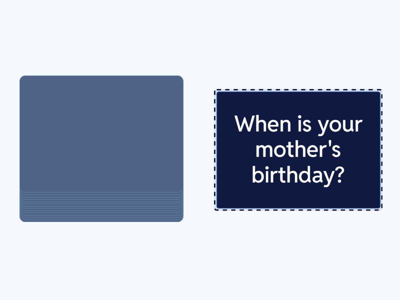 When is Christmas? , When is Easter? , When is your mother's birthday? , When is your best friend's birthday? , When do you have vacations? (I have vacations in...), When is Independence Day in your country? , When is Halloween? , When is the day of Love and Friendship in Colombia?, What is your favorite month? , What is your favorite celebration?, When is your birthday?, When is Valentine's Day?, Where are you now?, Where is the Eiffel tower?, Where is Cusco? .