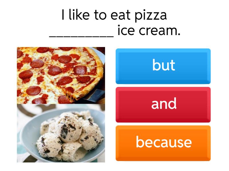 1) I like to eat pizza _________ ice cream. a) but b) and c) because 2) I can’t sleep ____________ I am hungry. a) because b) or c) and 3) Do you want to sleep _________ eat first? a) but b) because c) or 4) She eats an apple ________ drinks milk before bed. a) and b) because c) but 5) I want to sleep , _________ I have to study. a) and b) but c) because 6) He doesn't eat ceviche ________ he doesn't like fish. a) but b) or c) because 7) She wakes up at quarter to six on Fridays _____ quarter to seven on Thursdays. a) but b) and c) or 8) I have lunch at 1 PM _____ I never eat salad. a) but b) because c) or 9) My cousin _______ take a shower at night _____ he gets sick. a) doesn't - and b) don't - but c) doesn't - because 10) My friend and I ________ in the same school, ______ in different classes. a) am - but b) are - but c) is - and 11) My nephew ______ two daughters _______ one son, Katy and Mario. a) have - and b) has - or c) has - and