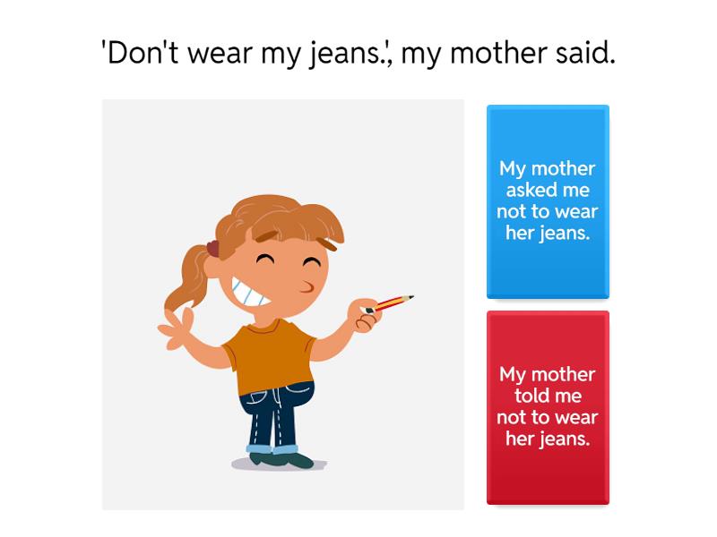 1) 'Don't wear my jeans.', my mother said. a) My mother asked me not to wear her jeans. b) My mother told me not to wear her jeans. 2) 'Do the washing up!', my friend said. a) My friend told me to do the washing up. b) My friend asked me to do the washing up. 3) 'Could you lay the table?', Lucy said. a) Lucy asked me to lay the table. b) Lucy told me to lay the table. 4) 'Tidy your room!', she said. a) She asked me to tidy my room. b) She told me to tidy my room. 5) 'Could you bring me a cup of coffee?' he said. a) It's a command. b) It's a request. 6) The reporting verb for a command is a) Tell b) Ask 7) 'Feed the dog', he said. a) It is reported speech. b) It is direct speech. 8) He asked me to play with her daughter. a) It is reported speech. b) It is direct speech. 9) The reporting verb for a request is a) Tell b) Ask 10) She told me to do my homework. a) 'Do your homework!', she said. b) 'Could you do your homework?', she said. 11) 'Never do that again.', my aunt said a) It's a request. b) It's a command.