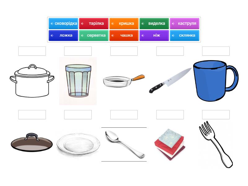 склянка, чашка, виделка, ложка, ніж, тарілка, серветка, каструля, сковорідка, кришка,