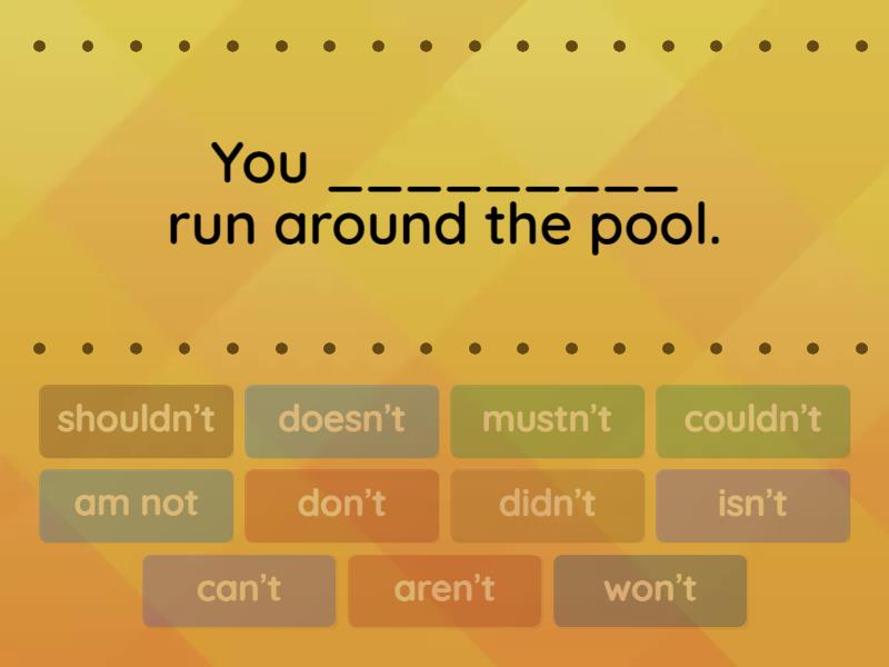 mustn’t - You _________ run around the pool., can’t - I’m sorry, I ______ help you right now., don’t -  Some people _______ spend money in expensive clothes. , doesn’t - Steve _______ know why his boss is so rude. , shouldn’t - Young people _________ do excessive physical activity. , won’t - I think that the next year we ________ go on vacation. , didn’t - The family _______ buy the house because it was too old. , couldn’t - The last year the students __________ speak this much in English. , isn’t - Technology _______ helping society. , aren’t - The workers _______ working in the office today. ,  am not - I ________ listening. ,
