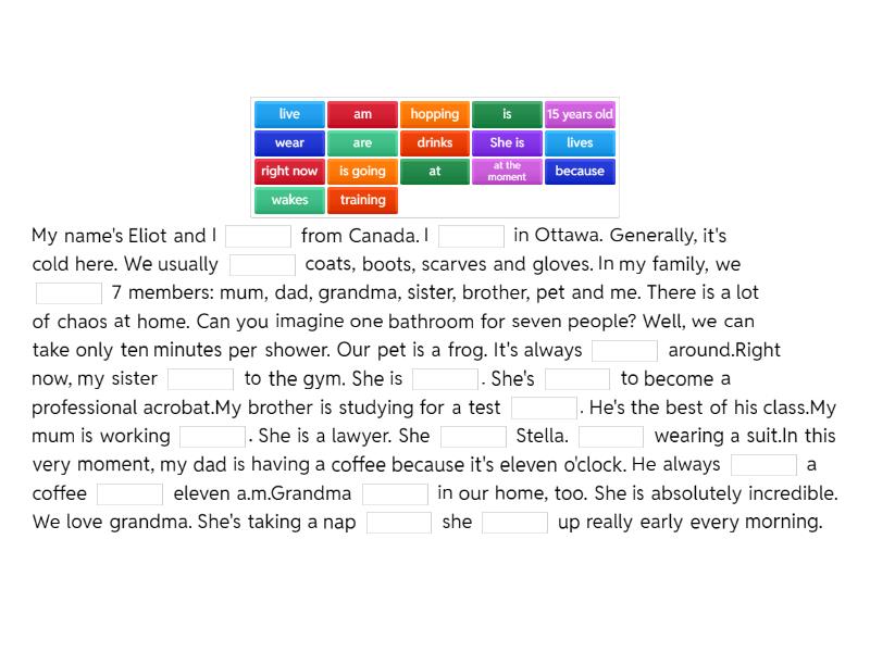 My name's Eliot and I ____ from Canada. I ____ in Ottawa. Generally, it's cold here. We usually ____ coats, boots, scarves and gloves. In my family, we ____ 7 members: mum, dad, grandma, sister, brother, pet and me. There is a lot of chaos at home. Can you imagine one bathroom for seven people? Well, we can take only ten minutes per shower. Our pet is a frog. It's always ____ around.Right now, my sister ____ to the gym. She is ____. She's ____ to become a professional acrobat.My brother is studying for a test ____. He's the best of his class.My mum is working ____. She is a lawyer. She ____ Stella. ____ wearing a suit.In this very moment, my dad is having a coffee because it's eleven o'clock. He always ____ a coffee ____ eleven a.m.Grandma ____ in our home, too. She is absolutely incredible. We love grandma. She's taking a nap ____ she ____ up really early every morning.