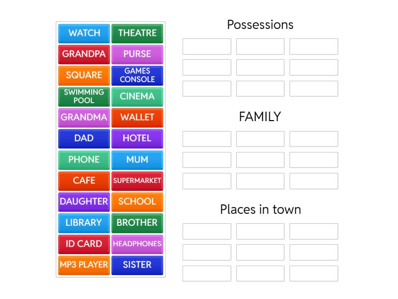 Possessions : HEADPHONES, PHONE, PURSE, GAMES CONSOLE, MP3 PLAYER, ID CARD, WALLET, WATCH, FAMILY: MUM, DAD, BROTHER, SISTER, DAUGHTER, GRANDPA, GRANDMA, Places in town: LIBRARY, SCHOOL, SQUARE, CINEMA, THEATRE, SWIMMING POOL, SUPERMARKET, HOTEL, CAFE,