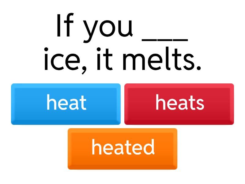 1) If you ___ ice, it melts. a) heat b) heats c) heated 2) If it rains, the ground ___. a) gets b) get c) got 3) If you mix red and blue, you ___ purple. a) get b) gets c) got 4) If you don’t water plants, they ___. a) die b) dies c) died 5) If water reaches 100°C, it ___. a) boil b) boils c) boiled 6) If the sun ___, it gets hot. a) shines b) shine c) shined