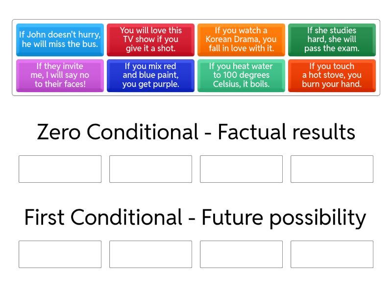 Zero Conditional - Factual results: If you mix red and blue paint, you get purple., If you heat water to 100 degrees Celsius, it boils., If you touch a hot stove, you burn your hand., If you watch a Korean Drama, you fall in love with it. , First Conditional - Future possibility: If she studies hard, she will pass the exam., If John doesn't hurry, he will miss the bus., If they invite me, I will say no to their faces!, You will love this TV show if you give it a shot.,