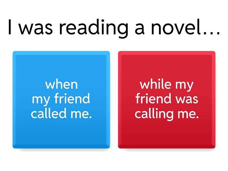 1) I was reading a novel… a) when my friend called me. b) while my friend was calling me. 2) Danny was watching TV... a) when something was touching his shoulder. b) when something touched his shoulder. 3) He screamed... a) when he was seeing something disappearing down the hall. b) when he saw something disappearing down the hall. 4) Dracula was shaving... a) when he cut himself. b) while he cut himself. 5) The girl was reading a book... a) while she was waiting for the bus. b) when she was waiting for the bus. 6) I screamed... a) when I saw a huge spider. b) while I saw a huge spider. 7) I was reading... a) my sister was playing. b) while my sister was playing.
