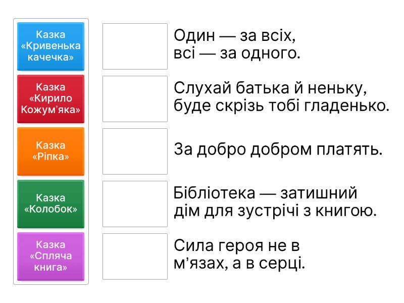 Казка «Кирило Кожум’яка» - Сила героя не в м’язах, а в серці., Казка «Кривенька качечка» - За добро добром платять., Казка «Спляча книга» - Бібліотека — затишний дім для зустрічі з книгою., Казка «Колобок» - Слухай батька й неньку, буде скрізь тобі гладенько., Казка «Ріпка» - Один — за всіх, всі — за одного.,