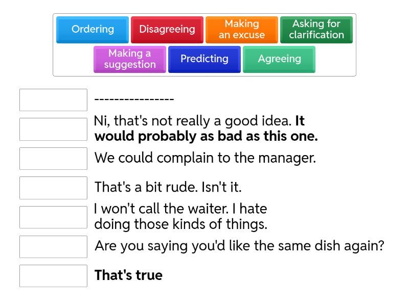 Predicting - We could complain to the manager., Making an excuse - That's a bit rude. Isn't it., Making a suggestion - Are you saying you'd like the same dish again?, Asking for clarification - Ni, that's not really a good idea. It would probably as bad as this one., Ordering - That's true, Agreeing  - I won't call the waiter. I hate doing those kinds of things., Disagreeing - ----------------,