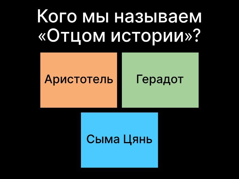 1) Кого мы называем «Отцом истории»? a) Герадот b) Аристотель c) Сыма Цянь 2) Какое было первое занятие древних людей? a) Земледелие b) Скотоводство c) Охота d) Ремесло 3) Как назывался первый коллектив древних людей? a) Племя b) Родовая община c) Первобытное стадо d) Союз племен 4) Первое примитивное орудие труда у древних людей? a) Рубило b) Мотыга c) Болас d) Дротик 5) На какие периоды делится эпоха камня? a) ранний,средний,поздний b) палеолит,мезолит,неолит c) древний,средний 6) На какие периоды делится палеолит? a) ранний,средний,поздний b) палеолит,мезолит,неолит c) древний,средний 7) Укажите хронологические рамки мезолита: a) 2,6 млн - 12 тысяч до н.э. b) 12 - 5 тысяч до н.э. c) 5 - 3 тысяч до н.э. 8) Укажите хронологические рамки неолита: a) 2,6 млн - 12 тысяч до н.э. b) 12 - 5 тысяч до н.э. c) 5 - 3 тысяч до н.э. 9) Ледниковый период на Земле наступил примерно: a) 200 тысяч лет назад b) 40 тысяч лет назад c) 100 тысяч лет назад 10) С появлением человека разумного появился постоянный коллектив древних людей: a) Племя b) Родовая община c) Человеческое стадо 11) Основанный на кровнородственных связях объединение людей, ведущие совместное хозяйство: a) Племя b) Родовая община c) Первобытное стадо 12) Как называлось орудие труда из гальки, обработанное с одной стороны? a) Чоппер b) Чоппинг c) Нуклеус d) Ретушь 13) Способ обработки камня — это: a) Чоппер b) Чоппинг c) Нуклеус d) Ретушь 14) Как называлось орудие труда из гальки, обработанное с двух сторон? a) Чоппер b) Чоппинг c) Нуклеус d) Ретушь 15) Что изображено на рисунке? a) Рубило b) Мотыга c) Зернотерка d) Топор 16) Что изображено на рисунке? a) Рубило b) Мотыга c) Зернотерка d) Топор 17) Кусок камня, от которого откалывались пластины для изготовления каменных орудий? a) Рубило b) Мотыга c) Ретушь d) Нуклеус 18) Мелкие каменные пластины длинной 1-2 см? a) Макролит b) Микролит c) Рубило d) Бифас 19) Оружие для ловли рыбы, виде копья с наконечником из кости животного: a) Рубило b) Мотыга c) Бифас d) Гарпун 20) Что изображено на рисунке? a) Рубило b) Гарпун c) Болас d) Бифас 21) Вера древнего человека в духов предков и души — это: a) Тотемизм b) Анимизм c) Магия d) Фетишизм 22) Вера древнего человека в происхождение от какого-либо животного — это: a) Тотемизм b) Анимизм c) Магия d) Фетишизм 23) Вера древнего человека в магическую силу предметов — это: a) Тотемизм b) Анимизм c) Магия d) Фетишизм 24) Вера древнего человека воздействовать на окружающий его мир и людей — это: a) Тотемизм b) Анимизм c) Магия d) Фетишизм 25) К какому периоду относится ледниковый период? a) раний палеолит b) средний палеолит c) поздний палеолит 26) В какой период сформировался человек разумный (кроманьонец)? a) раний палеолит b) средний палеолит c) поздний палеолит 27) В эпоху мезолита люди были вынуждены менять своё место обитания из-за: a) Миграции животных b) Изобретения орудий из металла c) Начала земледелия 28) Лук и стрелы были изобретены в эпоху: a) Палеолита b) Мезолита c) Неолита 29) Микролит — это орудие эпохи: a) Палеолита b) Мезолита c) Неолита 30) Первые люди, которые проникли на территорию Казахстана, были современниками: a) Питекантропа b) Австролопитека c) Неандертальца 31) Первые люди проникли на территорию Казахстана и освоили его около: a) 1 млн. лет назад b) 250 тысяч лет назад c) 2 млн. лет назад 32) К концу эпохи мезолита начался процесс одомашнивания некоторых животных и: a) развитие торговли b) окультуривание растений c) освоение металла d) строительство городов 33) «Неолит