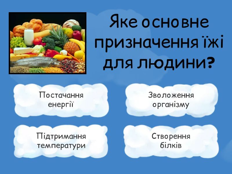 1) Яке основне призначення їжі для людини? a) Постачання енергії b) Зволоження організму c) Підтримання температури d) Створення білків 2) Які основні поживні речовини входять до складу їжі? a) Вітаміни і вода b) Білки, жири, вуглеводи c) Мінерали і кислоти d) Сіль і клітковина 3) Які речовини є головним джерелом енергії для клітин? a) Жири b) Білки c) Вуглеводи d) Вітаміни 4) Які речовини забезпечують будівельну функцію в організмі? a) Білки b) Вітаміни c) Мінерали d) Вуглеводи 5) Які речовини виконують переважно енергетичну та захисну функцію? a) Жири b) Вуглеводи c) Білки d) Мінерали 6) Які речовини регулюють обмін речовин і роботу ферментів? a) Вітаміни b) Вуглеводи c) Білки d) Клітковина 7) Які мінеральні речовини потрібні для побудови кісток і зубів? a) Калій і натрій b) Кальцій і фосфор c) Залізо і мідь d) Магній і сірка 8) Яке значення має вода в організмі людини? a) Утворює кісткову тканину b) Розщеплює жири c) Є джерелом енергії d) Забезпечує обмін речовин 9) Яка речовина входить до складу гемоглобіну і переносить кисень? a) Кальцій b) Фосфор c) Залізо d) Калій 10) Які продукти є головним джерелом білків? a) М’ясо, риба, яйця b) Хліб, картопля, цукор c) Олія, горіхи, масло d) Овочі, фрукти, зелень 11) Які продукти є основним джерелом вуглеводів? a) М’ясо, риба, горіхи b) Картопля, хліб, крупи c) Молоко, сир, яйця d) Олія, масло, сало 12) Що характеризує енергетичну цінність продукту? a) Кількість води в ньому b) Кількість вітамінів у складі c) Кількість енергії, що утворюється при розщепленні d) Кількість мінералів і солей