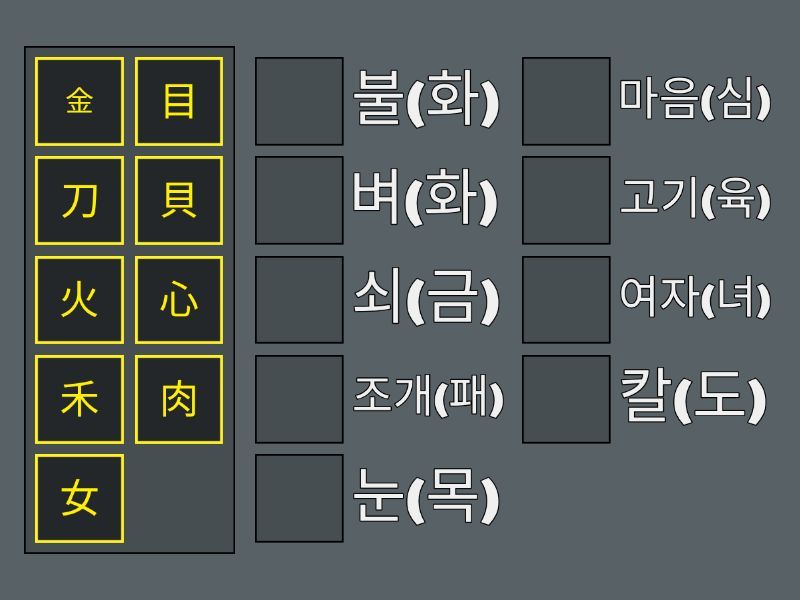 水 - 물(수), 人 - 사람(인), 心 - 마음(심), 手 - 손(수), 木 - 나무(목), 言 - 말씀(언), 口 - 입(구), 日 - 해(일), 土 - 흙(토), 貝 - 조개(패), 女 - 여자(녀), 刀 - 칼(도), 肉 - 고기(육), 火 - 불(화), 金 - 쇠(금), 禾 - 벼(화), 竹 - 대나무(죽), 力 - 힘(력), 大 - 큰(대), 示 - 보일(시), 田 - 밭(전), 目 - 눈(목), 衣 - 옷(의), 車 - 수레(거)(차), 一 - 하나(일),