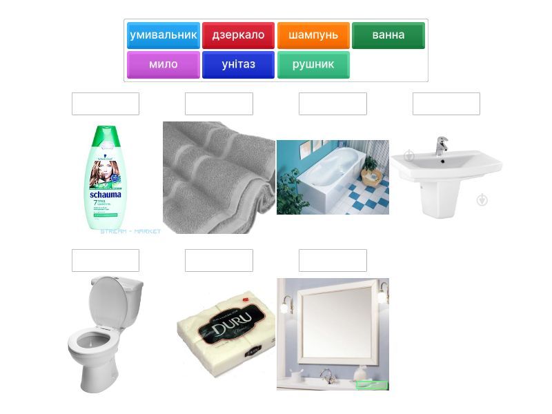 унітаз, ванна, умивальник, дзеркало, рушник, шампунь, мило,