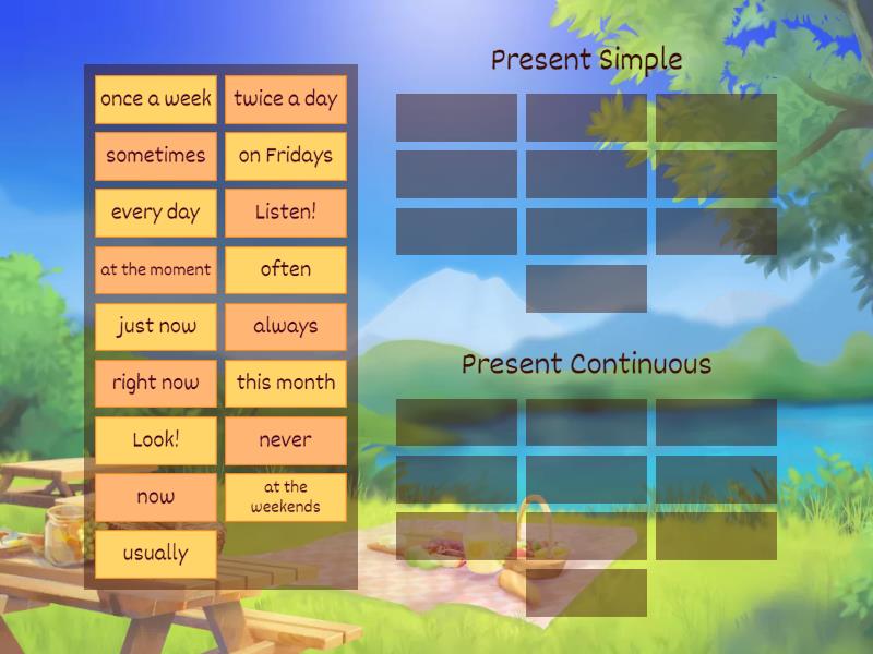 Present Simple: always, never, usually, sometimes, often, at the weekends, twice a day, on Fridays, every day, once a week, Present Continuous: now, just now, this month, right now, at the moment, Look!, Listen!,