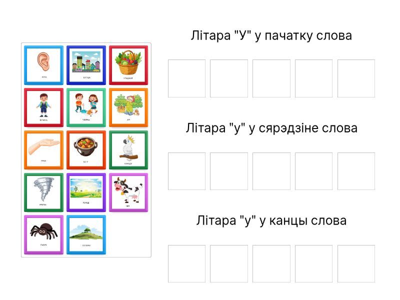 Літара "У" у пачатку слова: , , , , , Літара "у" у сярэдзіне слова: , , , , , Літара "у" у канцы слова: , , , ,