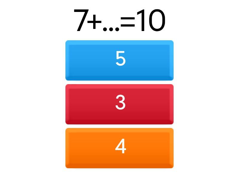 1) 1+...=10 a) 8 b) 7 c) 9 2) 2+...=10 a) 6 b) 4 c) 8 3) 3+...=10 a) 7 b) 6 c) 5 4) 4+...=10 a) 5 b) 4 c) 6 5) 5+...=10 a) 3 b) 4 c) 5 6) 6+...=10 a) 3 b) 5 c) 4 7) 7+...=10 a) 5 b) 3 c) 4 8) 8+...=10 a) 2 b) 4 c) 3 9) 9+...=10 a) 1 b) 2 c) 5