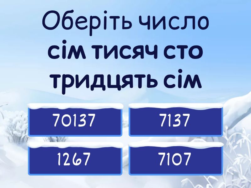 1) Оберіть число сім тисяч сто тридцять сім a) 70137 b) 7137 c) 1267 d) 7107 2) Оберіть число тридцять мільйонів чотириста одна тисяча сто сорок п'ять a) 30401145 b) 3401145 c) 340145 d) 34145 3) Оберіть число, записане у вигляді суми розрядних доданків: 5000 + 300 + 10 + 7 a) 531070 b) 53107 c) 50317 d) 5317 4) Розв'яжіть рівняння: 1000 + х = 3000 a) х = 200 b) х = 4000 c) х = 2000 d) х = 5000 5) Число 2046 правильно розкладене на розрядні доданки a) 200 + 40 + 0 + 6 b) 2000 + 40 + 6 c) 2000 + 400 + 6 d) 20 000 + 6 6) Як правильно прочитати число 2300 a) дві тисячі триста b) двісті тридцять c) двісті тисяч три d) двадцять три тисячі 7) Оберіть число, в якому виділено цифру розряду сотень тисяч a) 27380 b) 273880 c) 27388 d) 273088 8) Оберіть правильну послідовність чисел a) 3005, 3006, 3007, 1009 b) 2995, 2996, 2997, 2998 c) 235, 456, 123 9) Вкажіть число, у якому виділена цифра розряду десятків тисяч a) 327840 b) 302784 c) 327084 d) 307284 10) За час усієї подорожі туристи проїхали потягом 630 км, а автобусом - утричі менше. Яка довжина шляху всієї подорожі? a) 2345 b) 210 c) 840 d) 315