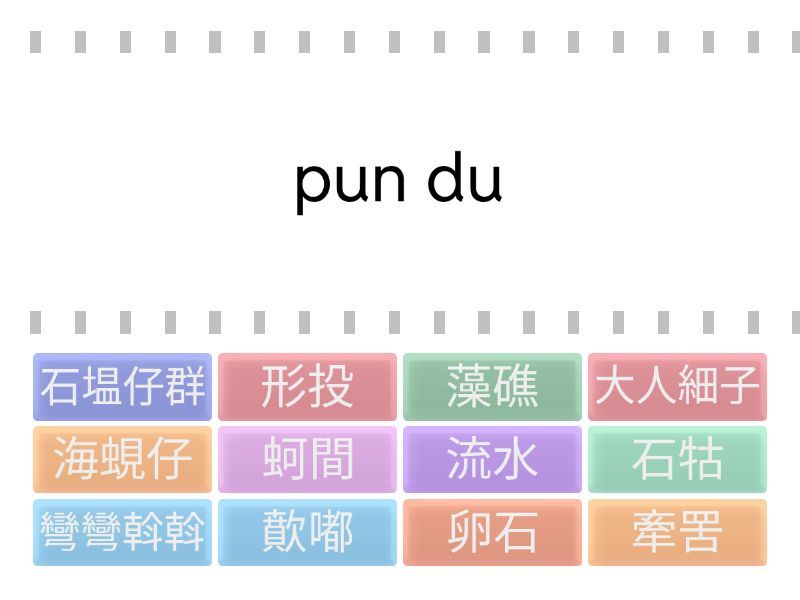 歕嘟 - pun du, 大人細子   - tai+ ngin seˇ ziiˊ, 牽罟 - kienˋ guˋ, 藻礁 - zauˊ ziauˋ, 蚵間 - o gienˋ, 石塭仔群 - shagˋ vunˋ er kiun, 石牯 - shagˋ guˊ, 卵石 - lonˊ shagˋ, 流水 - liu shuiˊ, 彎彎斡斡 - vanˋ vanˋ vad vad, 形投 - hin dau, 海蜆仔 - hoiˊ hanˊ er,