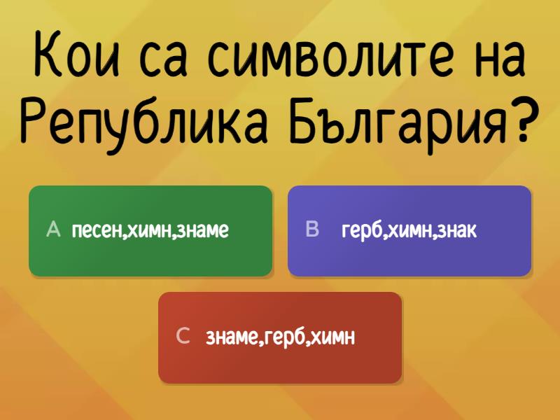 1) Кои са символите на Република България? a) песен,химн,знаме b) герб,химн,знак c) знаме,герб,химн 2) В какъв знак на картата са изобразени планините? a) лилав b) кафяв c) жълт 3) Коя е най-високата планина в България? a) Рила b) Витоша c) Родопи 4) Коя е най-дългата река в България? a) Искър b) Камчия c) Места 5) Най-старите жители на нашите земи са: a) траки b) римляни c) боляри