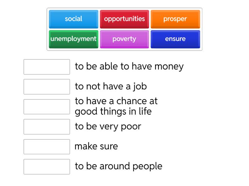 poverty - to be very poor, prosper - to be able to have money, ensure - make sure, social - to be around people, unemployment - to not have a job, opportunities - to have a chance at good things in life,