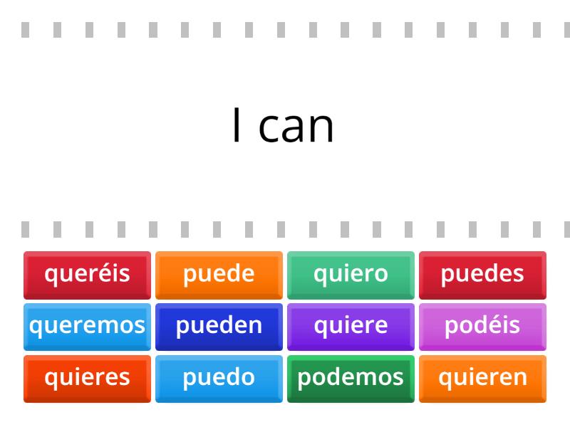puedo - I can, puedes - you (s) can, puede - he/she can, podemos - we can, podéis - you (pl) can, pueden - they can, quiero - I want, quieres - you (s) want, quiere - he/she wants, queremos - we want, queréis - you (pl) want, quieren - they want,