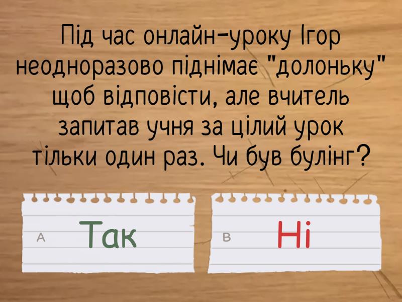 1) Під час онлайн-уроку Ігор неодноразово піднімає "долоньку" щоб відповісти, але вчитель запитав учня за цілий урок тільки один раз. Чи був булінг? a) Так b) Ні 2) Жанна відвідує гурток з малювання і демонструє чудові навички. Карина - менш успішна учениця. Щоразу коли Жанна відволікається від свого полотна, Карина намагається зіпсувати успішну роботу Жанни. Чи був булінг? a) Так b) Ні 3) Ілля відвідує заняття з футболу. Під час розминки один з товаришів випадково ударяє Іллю. Ілля вимагає, щоб той вибачився, проте у відповідь чує: "Відчепися" a) Так b) Ні 4) Микола підслизнувся на банановій шкірці і всі його товариші почали сміятися з нього. Чи був булінг? a) Так b) Ні 5) Марина отримала 1 бал за невиконане протягом тижня завдання практичної роботи. Через місяць Марина врешті виконує роботу та просить вчителя перевірити її та виправити "1". Вчитель відмовляє Марині, та повідомляє, що виправляти "1" не буде, через те, що спливли всі терміни здачі цього завдання. Чи був булінг? a) Так b) Ні 6) Денис з'їв часник за обідом та, забувши почистити зуби, пішов гуляти. На прогулянці Іван (друг Дениса) сказав: "Як жахливо від тебе смердить, тримай жуйку!". Чи був булінг? a) Так b) Ні 7) Дарина навчається у 8 класі. Однокласники Дарини ніколи не звертаються до неї на ім'я. Вони називають Дарину "крокодилом", через зелений колір спортивного костюму, що Дарина мала 2 роки тому. Чи був булінг? a) Так b) Ні 8) Макар дуже сором'язливий та невпевнений у собі хлопчик. Старший брат Макара часто каже йому, що через його непричетність до спільного шкільного життя, з ним ніхто не буде товаришувати. a) Так b) Ні 9) Михайло системно не виконує домашні завдання. Протягом останніх шести тижнів отримав чотири одиниці. Щоразу виставляючи 1 бал, вчитель телефонує мамі Михайла та просить контролювати виконання завдань. Мама обіцяє вжити відповідних заходів, але ситуація не змінюється. Чи був булінг? a) Так b) Ні 10) Катерина помітила, що з її кишені зникли 200 грн. Вона почала плакати та звинувачувати всіх своїх подружок у крадіжці. Подруги образилися на Катерину та не запросили її гуляти наступного дня. Чи був булінг? a) Так b) Ні 11) Оля має песика, вона його щоранку вигулює. Оля дуже тривожиться кожного разу, як іде гуляти з собакою, що зустрінеться з Оксаною (на 3 роки старшої за неї), бо Оксана вимагає у Олі гроші, погрожуючи, що як не дасть, то вона почне жбурляти камінням в песика. Чи був булінг? a) Так b) Ні 12) Станіслав та Олег посварилися та побилися на ґанку школи. Молодші школярі, побачивши це, повідомили про дійство адміністрацію школи. Директор школи запросив бешкетників до себе в кабінет і попередив, якщо така поведінка повториться, то школа звернеться до поліції та до соціальної служби. Чи був булінг? a) Так b) Ні