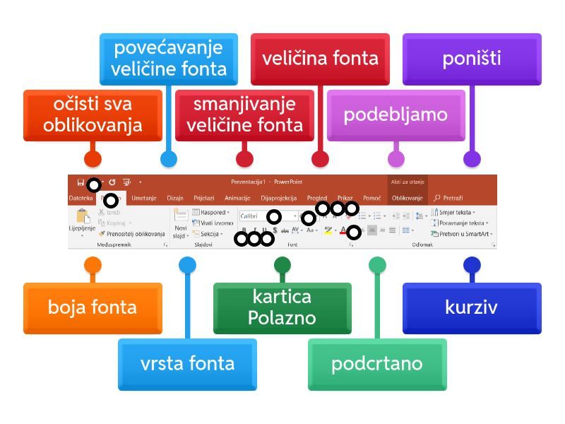 vrsta fonta, veličina fonta, boja fonta, kartica Polazno, podebljamo, kurziv, podcrtano, očisti sva oblikovanja, poništi, povećavanje veličine fonta, smanjivanje veličine fonta.