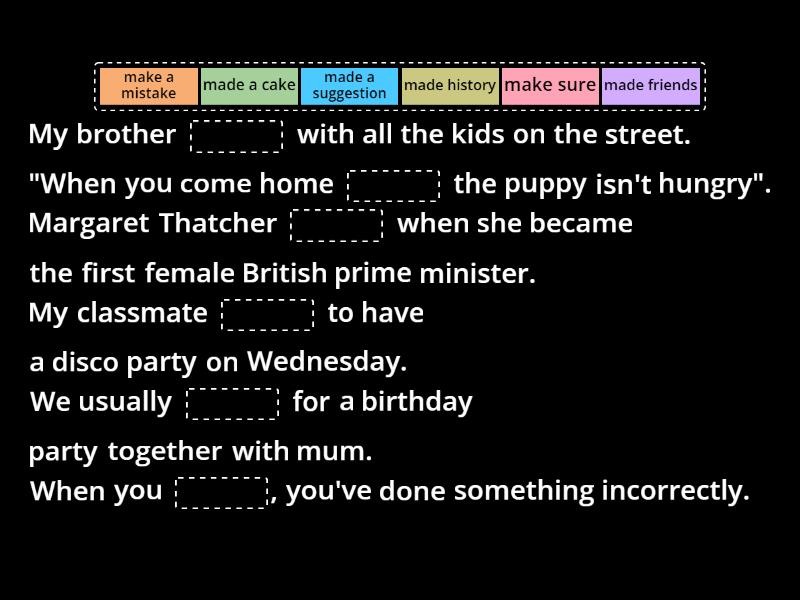 My brother ____ with all the kids on the street. "When you come home ____ the puppy isn't hungry". Margaret Thatcher ____ when she became the first female British prime minister. My classmate ____ to have a disco party on Wednesday. We usually ____ for a birthday party together with mum. When you ____, you've done something incorrectly.