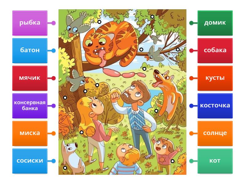 сосиски, собака, солнце, домик, рыбка, косточка, кот, кусты, консервная банка, батон, мячик, миска.