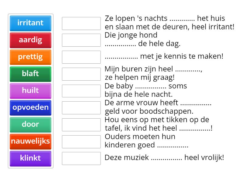 opvoeden - Ouders moeten hun kinderen goed ................, prettig - ................. met je kennis te maken!, blaft - Die jonge hond ................ de hele dag., nauwelijks - De arme vrouw heeft ................ geld voor boodschappen., klinkt - Deze muziek ................ heel vrolijk!, irritant - Hou eens op met tikken op de tafel, ik vind het heel ................!, aardig - Mijn buren zijn heel ............., ze helpen mij graag!, huilt - De baby ................ soms bijna de hele nacht., door - Ze lopen 's nachts ............. het huis en slaan met de deuren, heel irritant!,