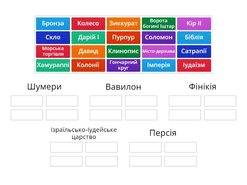 Шумери: Колесо, Гончарний круг, Бронза, Клинопис, Вавилон: Зиккурат, Хамураппі, Ворота богині Іштар, Місто-держава, Фінікія: Морська торгівля, Колонії, Пурпур, Скло, Ізраїльсько-Іудейське царство: Біблія, Давид, Іудаїзм, Соломон, Персія: Кір ІІ, Дарій І, Сатрапії, Імперія,