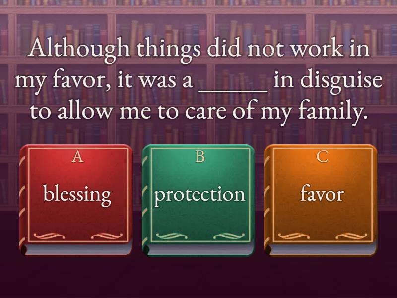 1) Although things did not work in my favor, it was a _____ in disguise to allow me to care of my family. a) blessing b) protection c) favor 2) After our first attempt failed, we had to go back to _____ one. a) place b) square c) position 3) Without a recognised certificate, I don't stand the _____ of getting a job anywhere. a) chance b) possibility c) odds 4) _____ no circumstances should such acts be justified or condoned. a) Over b) Above c) Under 5) She is _____ regarded as a surgeon and has an excellent track record. a) greatly b) highly c) distinctly 6) I see no _____ in complaining because it doesn't lead you anywhere. a) point b) reason c) purpose 7) She finally _____ to terms with her addictions at her third rehab clinic and rarely drank again. a) turned b) got c) came