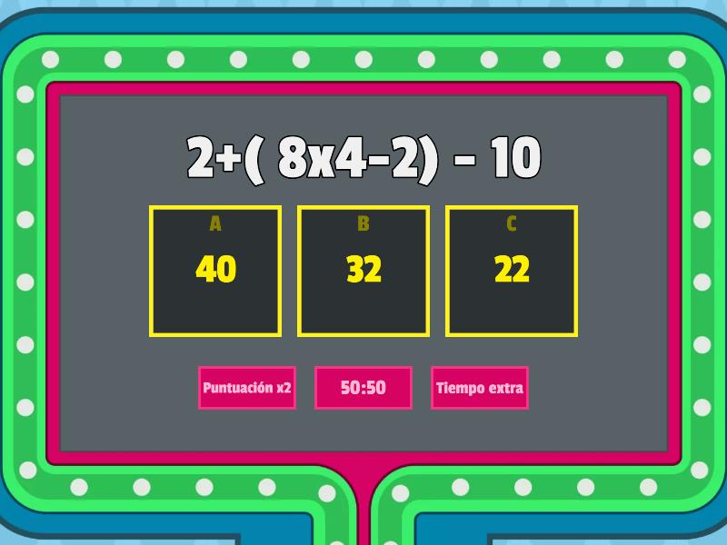 1) 2+( 8x4-2) - 10 a) 40 b) 32 c) 22 2) 20: 4 +( 6x5) a) 35 b) 45 c) 25 3) 30+2x( 6+4)-7 a) 44 b) 42 c) 43 4) 2x3x4+6-10 a) 30 b) 20 c) 40 5) (9x2) + ( 5x9) a) 62 b) 63 c) 64 6) 100: 2 +(8x10) a) 140 b) 120 c) 130