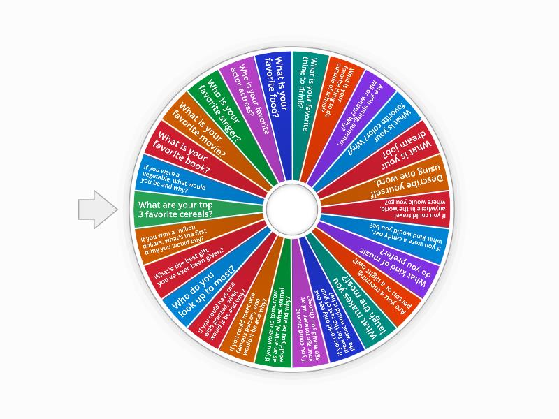 1) If you were a vegetable, what would you be and why? 2) What is your favorite book? 3) What is your favorite movie? 4) Who is your favorite singer? 5) Who is your favorite actor/actress? 6) What is your favorite food? 7) What is your favorite thing to drink? 8) What is your favorite thing to do outside of school? 9) Are you spring, summer, fall or winter? Why? 10) What is your favorite color? Why? 11) What is your dream job? 12) Describe yourself using one word. 13) If you could travel anywhere in the world, where would you go? 14) If you were a candy bar, what kind would you be? 15) What kind of music do you prefer? 16) Are you a morning person or a night owl? 17) What makes you laugh the most? 18) If you could only eat one meal for the rest of your life, what would it be?  19) If you could choose your age forever, what age would you choose? 20) If you woke up tomorrow as an animal, what animal would you be and why? 21) If you could meet one famous person, who would it be and why? 22) If you could have one wish granted, what would it be and why? 23) Who do you look up to most? 24) What's the best gift you've ever been given? 25) If you won a million dollars, what's the first thing you would buy? 26) What are your top 3 favorite cereals?