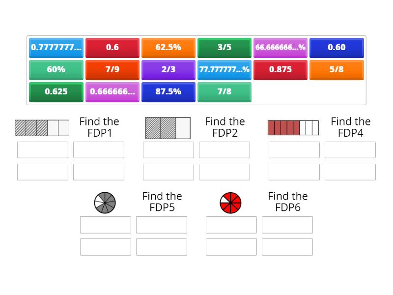 Find the FDP1: 3/5, 60%, 0.6, 0.60, Find the FDP2: 2/3, 0.666666..., 66.666666...%, Find the FDP4: 5/8, 0.625, 62.5%, Find the FDP5: 7/9, 0.7777777..., 77.777777...%, Find the FDP6: 7/8, 0.875, 87.5%,